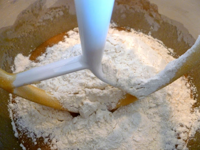 Sift in flour, salt, baking powder, and baking soda, and mix until just blended.